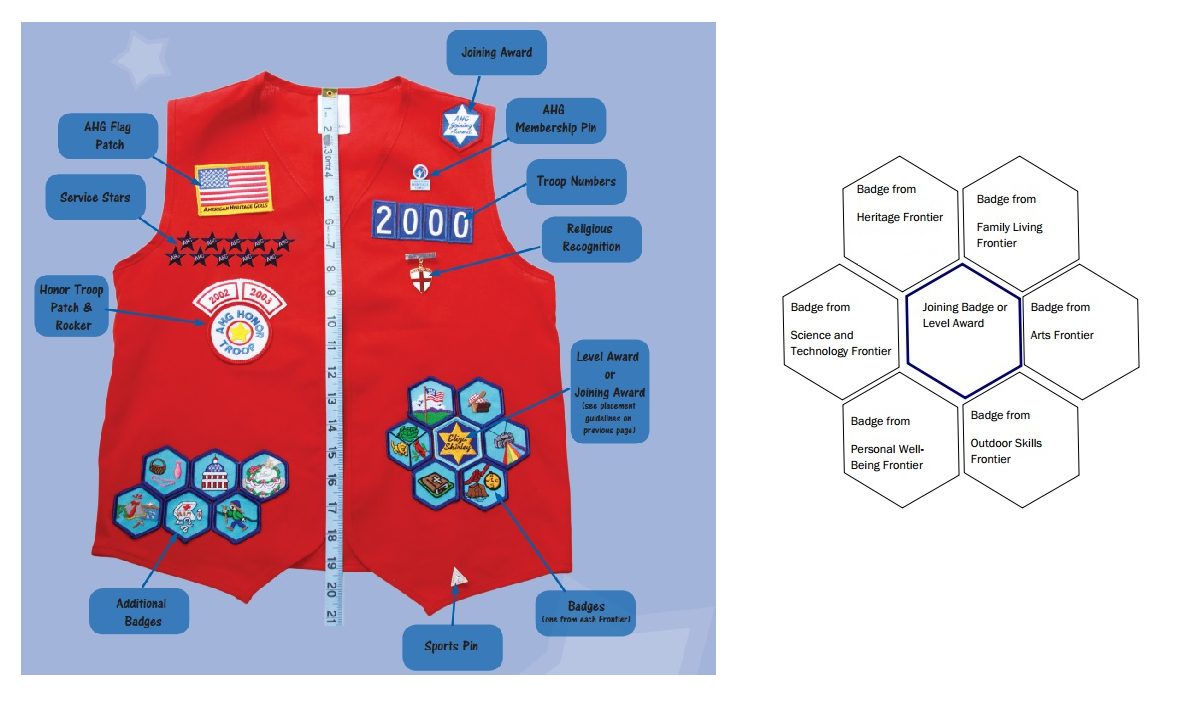 The Joining Award goes at the center of a new flower on the left (or on the left shoulder, if the girl has earned her Level Award to start a new flower), and subsequent achievement badges are placed as the petals around the flower (one from each frontier). Additional achievement badges are affixed in a honeycomb pattern on the lower right. For those looking for an alternative to sewing them on, you can order sheets of Badge Magic adhesive, which is washable and permanent. Simply apply, peel and press!